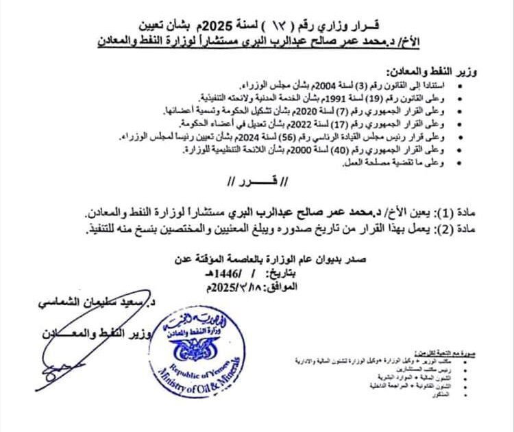 أصدر وزير النفط والمعادن في الحكومة الشرعية قرارًا وزاريًا يقضي بتعيين السيد “محمد عمر البري” مستشارًا لوزارة النفط والمعادن.