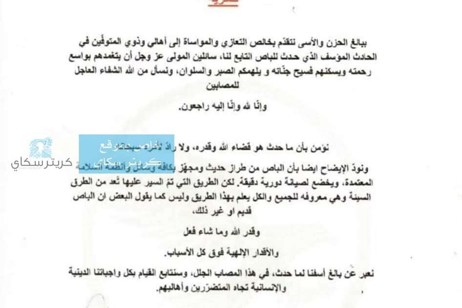 بدأت الشركة بيانها، المؤرخ بتاريخ 5 نوفمبر 2025م، بالإعراب عن بالغ الحزن والأسى، سائلة المولى عز وجل أن يتغمد المتوفين بواسع رحمته ويسكنهم فسيح جناته، وأن يلهم أهلهم الصبر والسلوان، وتمنت الشفاء العاجل للمصابين.