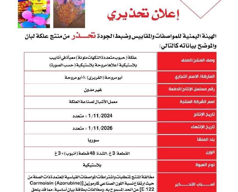 استخدام مصطلحات عامة مثل “طعومات صحية” و”الصبغات الصحية” دون توثيق علمي. وعليه، تؤكد الهيئة أن تداول هذا المنتج يُعد مخالفاً للأنظمة المعمول بها، وتدعو الجميع إلى تجنب شرائه أو توزيعه، والإبلاغ عن أي حالات تواجده في الأسواق. وتدعو الهيئة جميع المستهلكين إلى التحقق من بيانات المنتجات قبل شرائها، والاعتماد على المنتجات المطابقة للمواصفات المعتمدة حفاظاً على سلامتهم وسلامة أطفالهم.