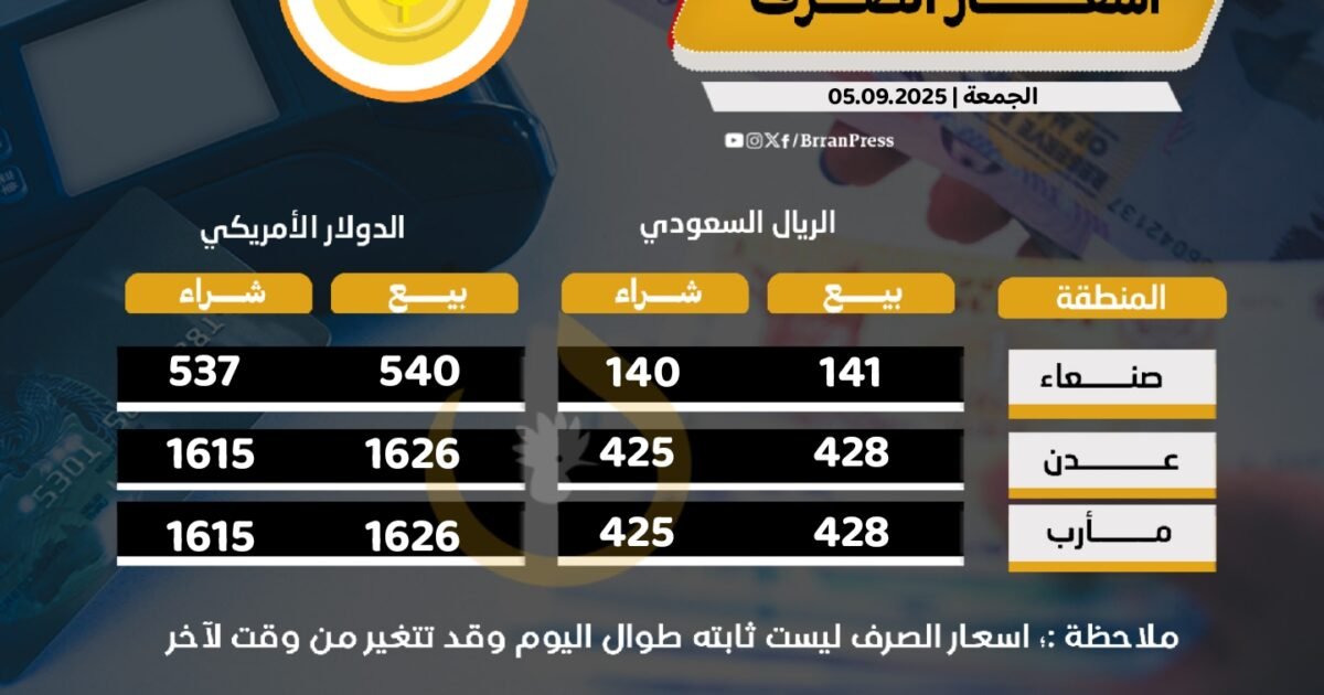 الرئيسية ⁄ شؤون محلية ⁄ تحركات الريال اليمني اليوم: أسعار الصرف في صنعاء وعدن ومأرب مقابل الدولار والريال السعوديشؤون محلية تحركات الريال اليمني اليوم: أسعار الصرف في صنعاء وعدن ومأرب مقابل الدولار والريال السعودي MO سبتمبر 5, 2025سبتمبر 5, 202566 شارك على فيسبوكشارك على تويتر الريال السعوديالريال اليمنيالصرف شارك على فيسبوكشارك على تويتر تصفّح المقالات السابق بين السياسة والأخوة: ماذا تكشف لقطات لقاء المحمدين؟التالي شوبير يفجر مفاجآت بشأن الجهاز الفني للأهلي بعد رحيل ريبيرو