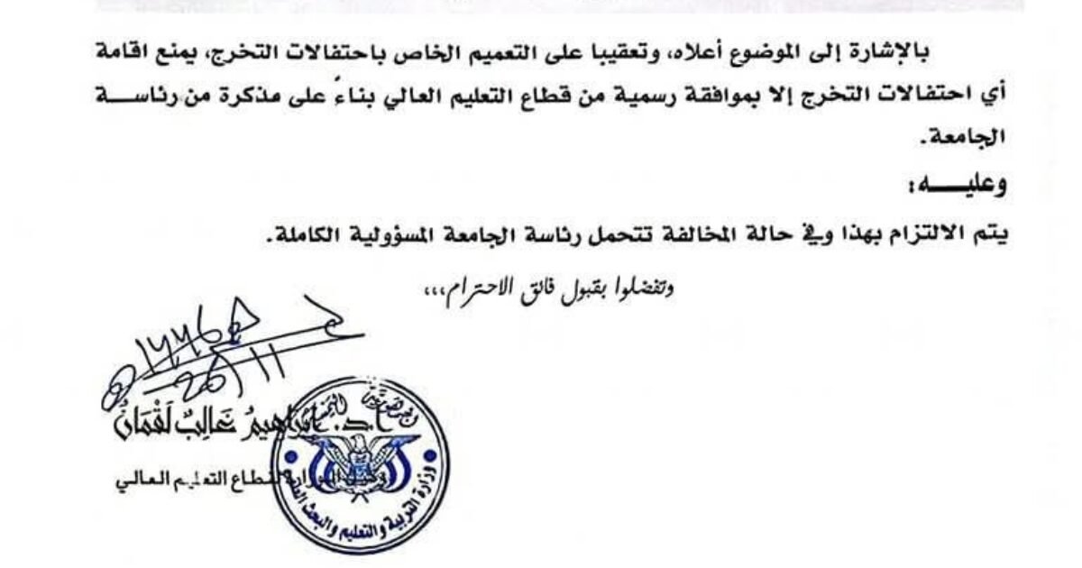 أفادت وزارة التربية والتعليم العالي والبحث العلمي بصنعاء بتعميم هام لرؤسا الجامعات الحكومية والاهلية بخصوص احتفالات التخرج ..